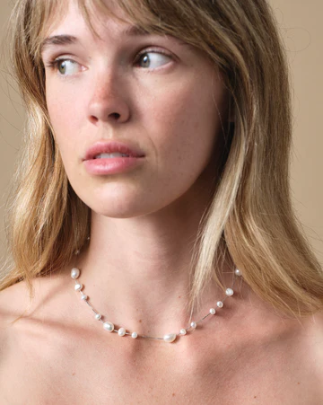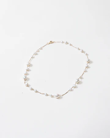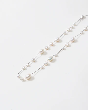 クラシックなパールネックレスの現代的なアレンジ。このチョーカーは、有機的に成形された真珠が繊細なチェーンに沿って配置されており、それぞれが自然な形で唯一無二です。